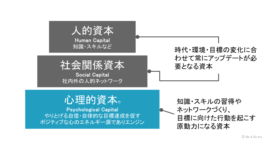心理的資本(Psychological Capital/略称PsyCap)とは、ポジティブな心理的エネルギーで、積極的な行動や自律的な目標達成を促すエンジンです。